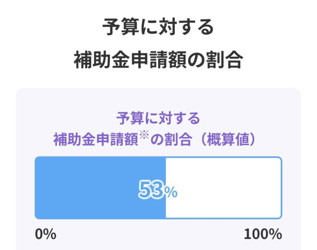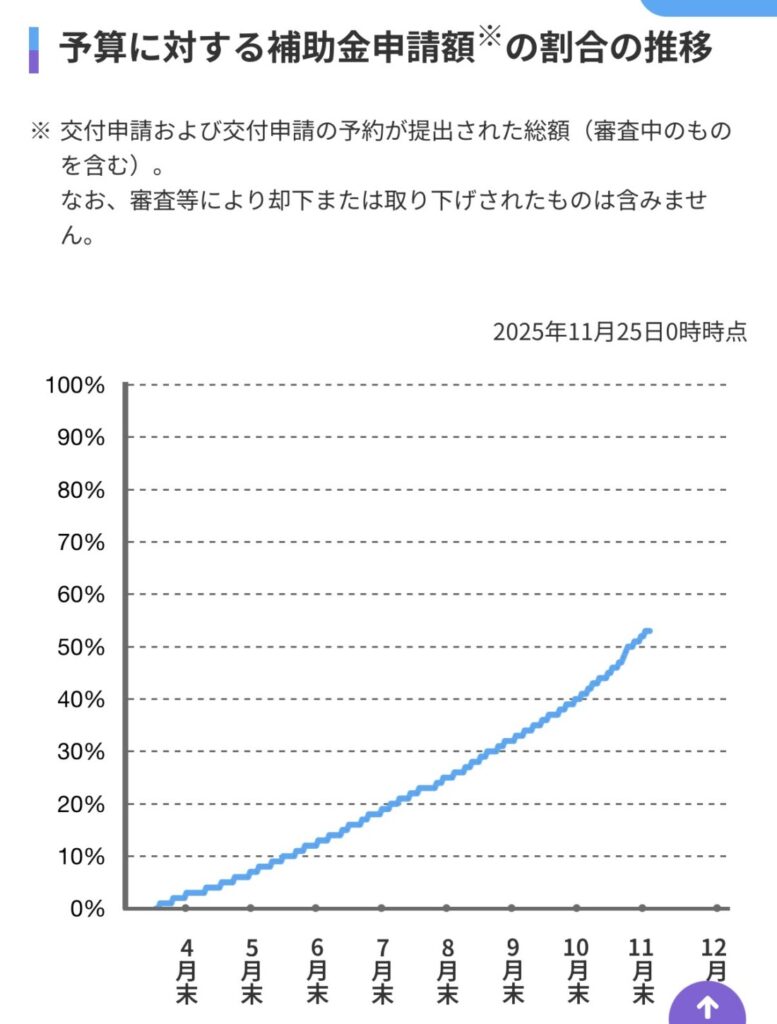 現時点(本日)で、先進的窓リノベの補助金申請状況は 53% と、まだ約半分にとどまっています。仮に12月施工分がすべて完了したとしても 75%前後 ではないかと見込まれています。