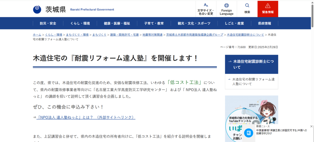 先日、茨城県が主催の『耐震リフォーム達人塾』を受講してきました。