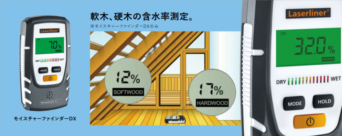 調査の際には、モイスチャーファインダーという調査道具を用いて、木材の含水率を計測します。