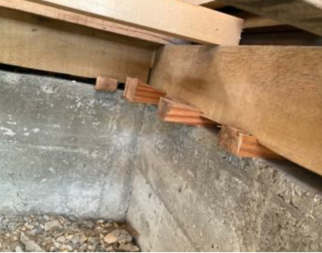 これは、一例ですが、今と比べると昔は、柱材や梁、基礎の精度がバラバラで、写真のように水平を出すために土台の下に木材をはめて調整している場合がございます。この木材がシロアリなどの原因でボロボロになってしまうと土台は、下がり、建物自体が傾く原因にもなります。