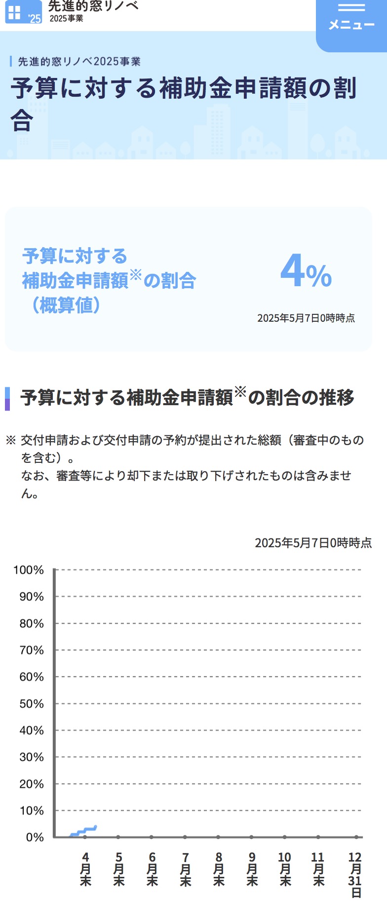 まだ、4%ですので、急に予算がなくなることは、ないかとは思われますが、昨年は、8月時点で6割ほどに達しておりましたので、少しでもお考えであれば、早めのご検討をお勧め致します。