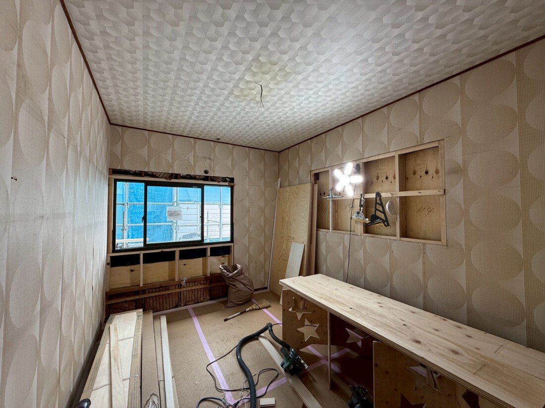 写真右側の壁がくりぬかれているいる部分に元々窓がありましたが、綺麗に外し、壁を作っている途中です。