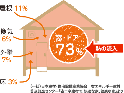 窓・ドアの開口部が圧倒的に熱の流入が高いことがお分かりいただけるかと思います。
