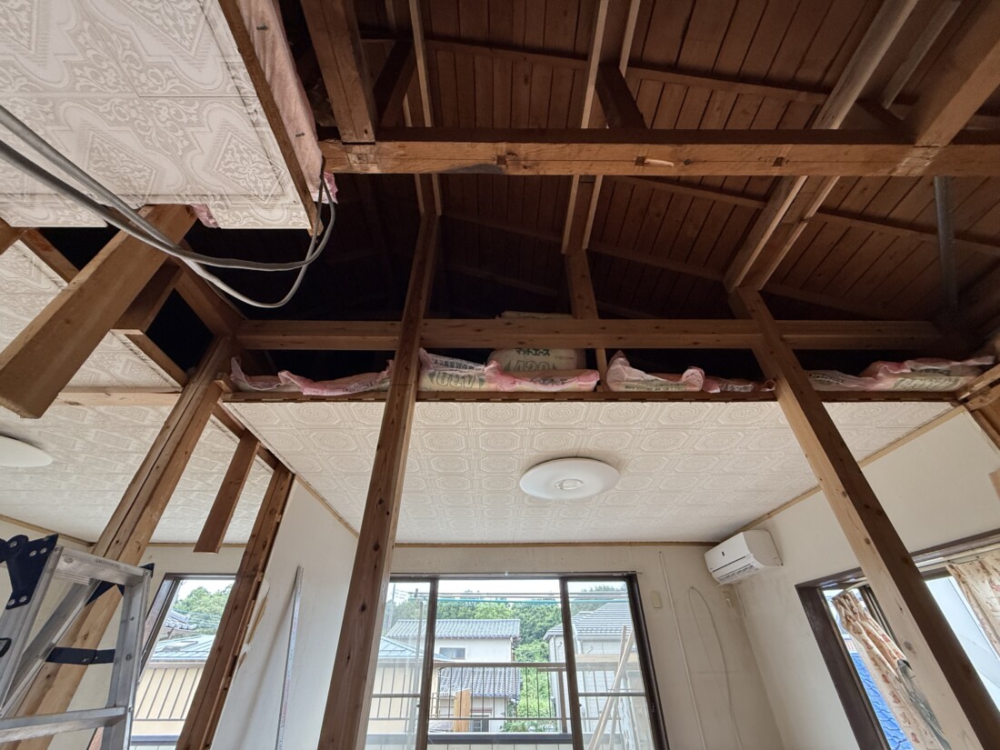 天井も新しいクロスを張る前に下地を作り直す必要があるため、まずは解体作業を行いました。構造材が露わになり、劣化状況を丁寧に確認したところ、躯体に著しい劣化は見られませんでした。