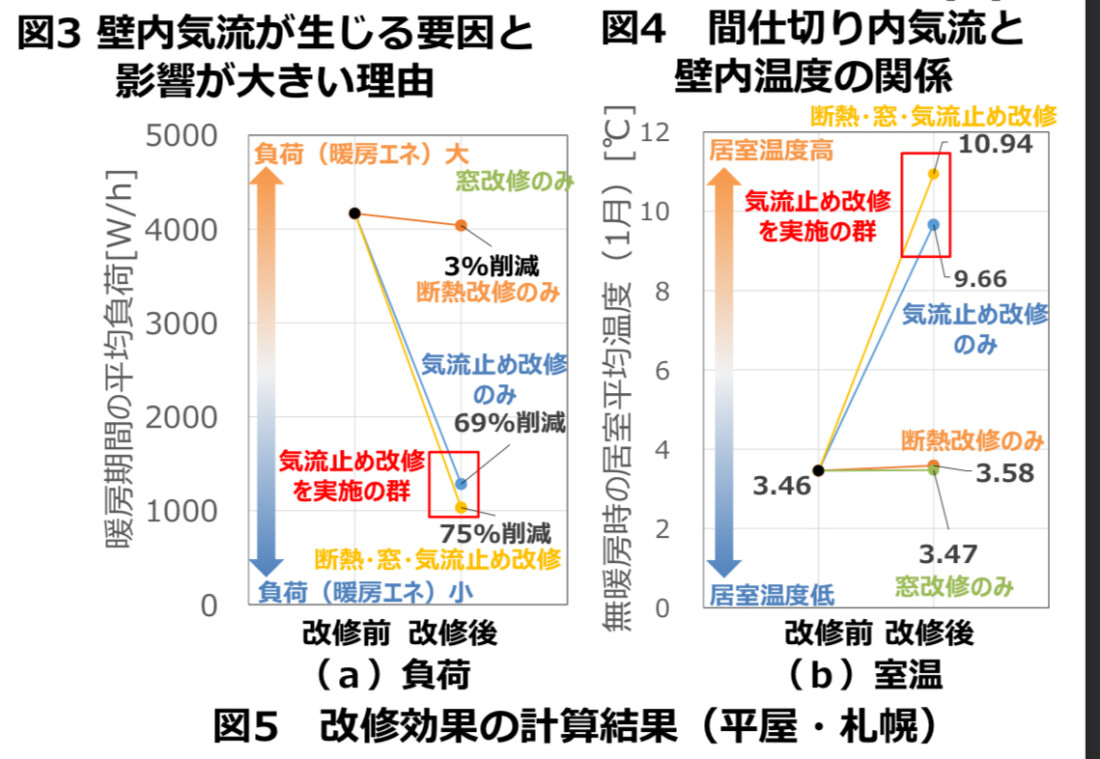 北海道の研究機関では、断熱・窓・気流止めの改修により暖房エネルギー負荷が最大75%削減された事例が報告されています(※北海道総研資料)。