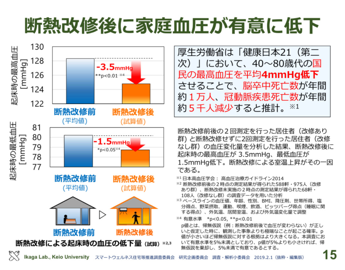 国土交通省が実施したスマートウェルネス住宅調査では、断熱改修後に起床時の最高血圧が平均3.5mmHg低下したとされており、