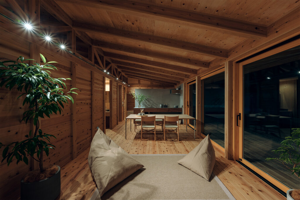 柱や梁だけでなく、床・壁・天井まで空間全体を木で構成。