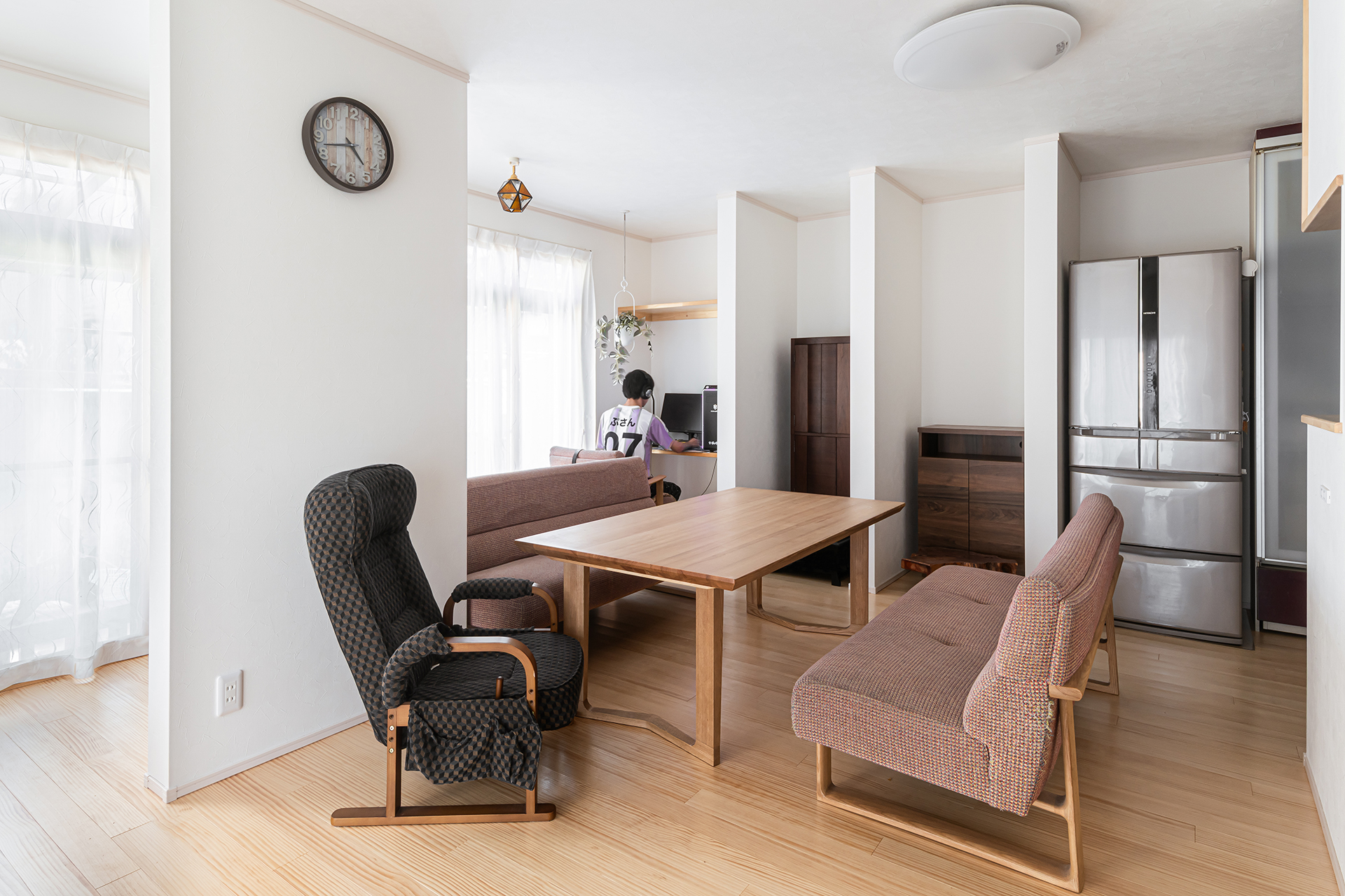リノベーションでは、まず南に面した和室2間とリビングをひとつの空間にまとめることで、敷地条件を最大限に活かした明るく開放的なLDKへと生まれ変わりました。