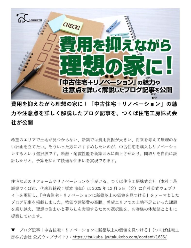 住宅リフォーム・リノベーションを手がけるつくば住宅工房株式会社は、2025年12月5日(金)に公式サイトを更新。物価や建築費の上昇、土地不足といった課題に向き合いながら、実際の体験談を交えて理想の暮らしを叶えるヒントを紹介しています。