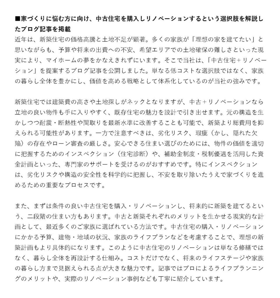 ブログでは、新築住宅の価格高騰や土地不足により、理想の住まいづくりに悩む方に向けて、「中古住宅+リノベーション」という選択肢を解説した記事を公開しています。